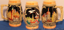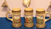 In our time over in Europe we went to many places where beer was a major attraction (Stuttgart & Cannstatter Volksfest, Munich & Oktoberfest, Çeské Budêjovice [aka Budweis], Plzeň [birthplace of the "pilsner" style of brewing], etc.), and took tours of some of the breweries. I often snagged a souvenir beer mug or three for my collection on these excursions. Now, as we get ready to move to Maine, I have photographed the collection for a visual record, and here they are: |