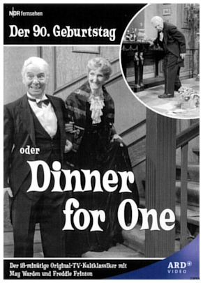 Dinner for One, also known as The 90th Birthday, or by its corresponding German alternative title, Der 90. Geburtstag, is a two-hander comedy sketch written by British author Lauri Wylie for the theatre. German television station Norddeutscher Rundfunk (NDR) recorded a performance of the piece in 1963, in its original English language, with a short introduction in German. This comedy sketch went on to become the most frequently repeated TV programme ever.
