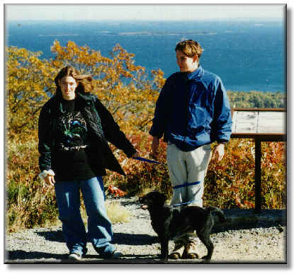 Audrey, Björn, and puppy Buddy at Mt. Battie in Camden ME |