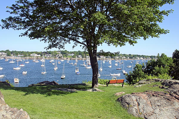 This peaceful bench overlooking a crowded and busy harbor can be found in Marblehead MA