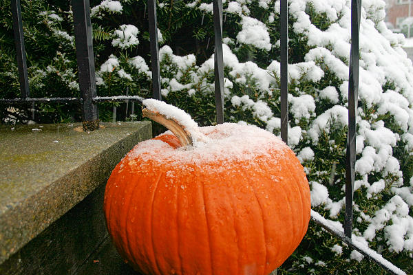 We had an early dusting of snow that year, soon after Halloween. The pumpkins had not rotted on the steps as they usually do, but were firm and sharp as the day we bought them. The half-inch or so of snow was wet and doomed to melt quickly, but I caught this shot about 30 minutes after it had stopped snowing. It was still cloudy and a bit foggy, so the diffuse light made the snow stand out all the more.