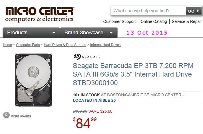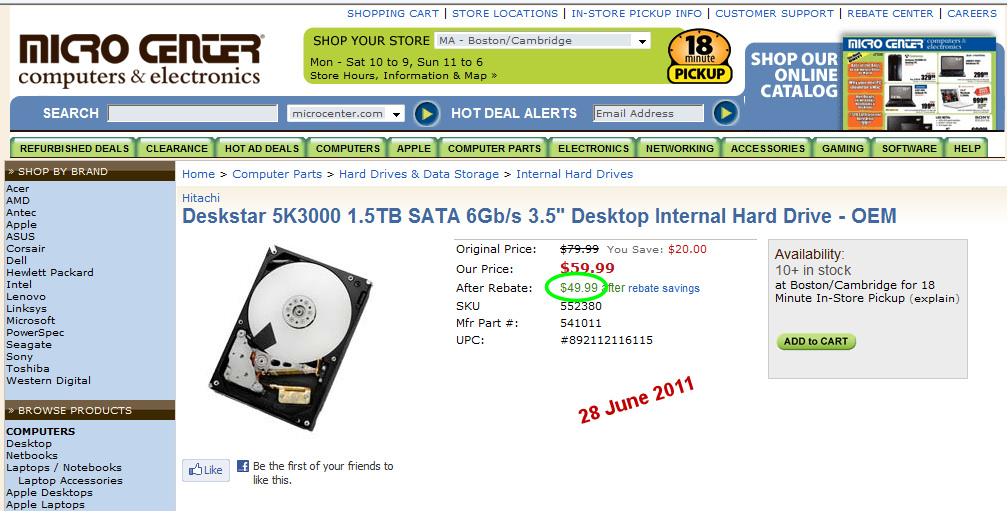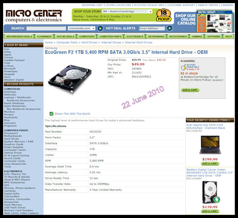 Let's think about that 10 MB hard drive for a moment. I've bought a number of hard drives over the years; the first one was that $1,100 10 MB Maynard hard drive for the IBM PC2. In 2005 I bought a 250 GB replacement drive for $68.00. The most recent purchase was a 1 TB (1,000 GB) additional drive for under $50, and advertised better prices have been seen since. If we compare the cost per megabyte, we have: