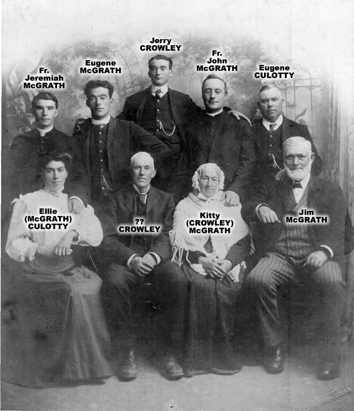 "When I saw the picture, I knew immediately that the people in it weren't the ones you thought they were, except, of course, No. 1 who is Uncle Jerry McGRATH. I sent a photo copy of the picture on to Sr. Gemma [McGRATH] of Baltovin. She and her brother Fr. Jim [McGRATH] were greatly moved, because, as she said, it was a photocopy of a photo that they had in their sitting room in the old house (next door to my home). I'm enclosing a key to the picture which she forwarded to me. The venerable looking old man (#9) is Jim McGRATH, uncle to your grandfather, so he hailed from Knockbrack - a farm was bought for him in Baltovin. The old lady (#8) is his wife, Kitty CROWLEY. Sr. Gemma thinks #7 is her brother (father of #3, Jerry CROWLEY). #2, #4, & #6 are children of Jim & Kit McGRATH. Fr. John McGRATH (#4) was a priest in Boston! Eugie CULLOTY (#5) is the husband of Ellie McGRATH (#6). Finally, #1, #2, #4, & #6 are first cousins. I know that your niece and yourself will be disappointed, but at least, five members of the group are related to us. Fr. Jim (Gemma's brother) is in a home in Tralee. He asked her to frame the copy she showed him (I sent her two), he was so excited and pleased to see it again."