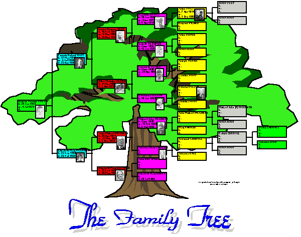 This picture was built in stages. First I generated a Left-To-Right-Optimum Descendent Chart for myself in the companion charting program (EasyChart) that comes with Sierra's Generations. Generations allows you to associate scanned images (in BMP or GIF format) with individuals in the genealogy database, so these photos are straight from the genealogy database. The photos were scanned in and enhanced and modified using MicroGrafx Picture Publisher. Then I pasted the chart into Microsoft's PowerPoint. The tree is standard PowerPoint clip art. The title text at the bottom was built using the TextArt application that comes with WordPerfect for Windows.