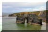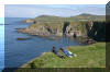We started the day again with another traditional Irish Breakfast at the B&B, then packed up our things and checked out, heading back around the Slea Head road. First we came to a car pull-off by the side of the road near Dunquin that we had somehow missed the day before. The view was spectacular, and the car park was right next to the top of the towering cliff that fell a couple of hundred feet straight down to the rocks and ocean below…. No fence, no railing. We crept up to the edge on our bellies to peer over (chicken-hearts that we were). There was a most amazing road on the other side of a cove that wound its way down the cliff to a pier at the foot of the cliffs. I’ve never seen such a steep road – you’d need a tank just to drive it!